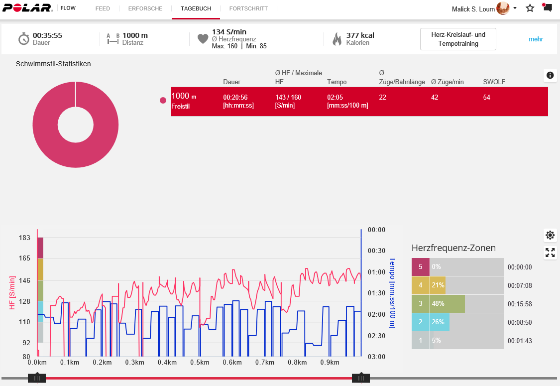 Insgesamt war ich 35 Min. gemütlich am Schwimmen.