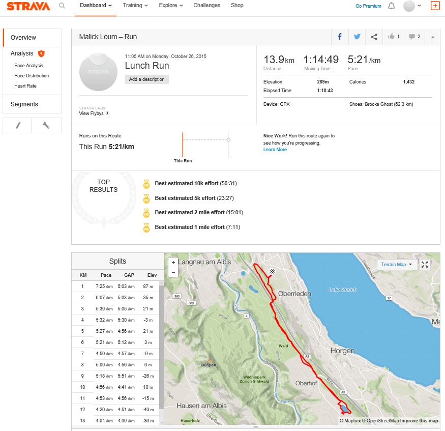 Zurückgelegte Distanz: 14.12 KM (gem. Polar V800) / 13.90 KM (gem. Catchme/Strava.com)