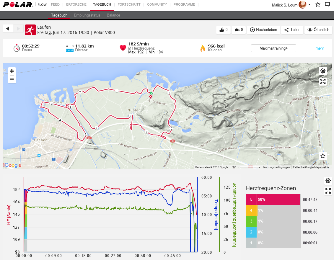 Trotz meiner schlechten Verfassung konnte ich ein gutes Tempo aufrechthalten. Im Vergleich zu meinem Testlauf vom Samstag, 11.06.2016 konnte ich meine Pace um 0:46 Min./KM verbessern. Der Wettkampf-Effekt ist also nicht zu unterschätzen.